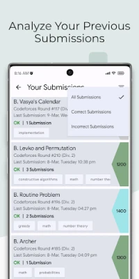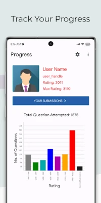Get your Submissions to the problems of Codeforces, view them problem wise, filter them according to the Tags, know your Incorrect submissions. Graphical Representation of No. of Questions vs Rating. Also know your Rating changes and Rank in Participated Contests of Codeforces.
