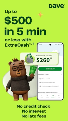 1-Dave is not a bank. Banking services provided by Evolve Bank and Trust, Member FDIC, or another partner bank, which issues the Dave Debit Card through a license from Mastercard®. ExtraCash amounts range from $25-$500, typically approved in 5 min, with an overdraft fee equal to the greater of $5 or 5%. Multiple overdrafts may be required. Not all members qualify for ExtraCash and few qualify for $500. ExtraCash is repayable on demand. Must open an ExtraCash overdraft deposit account and Dave Checking account. Up to $5 monthly membership fee for ExtraCash, Income Opportunity Services, and Financial Management Services. Optional 1.5% fee for external debit card transfers.