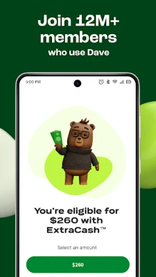 There’s a small monthly membership fee that gives you full access to our features, including ExtraCash™, Goals, & Surveys.(1) With Dave, you can monitor your money 24/7 & make transactions securely.