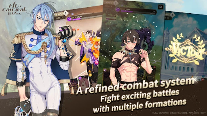 NU: Carnival - Bliss is a turn-based RPG. Freely choose up to five characters to form a team that suits your playing style, using type matchups and character skills to achieve victory. As each of your allies gets hit in battle, their outfits will gradually disintegrate, and their expressions and voice lines change, enriching the battles. Do you want to fight to your heart's content in a new world? High-difficulty stages and special game modes are made available from time to time, waiting for you to rise to the challenge!